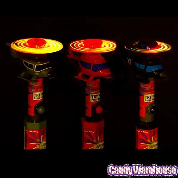 Helicopter comes to the rescue! Light patterns flash in the propeller hub as the powerful, child-safe fan spins. A powerful Lite Up Cool Pop Fan with a lollipop in the handle. The fan blades are made of flexible foam sheets to eliminate safety concerns.