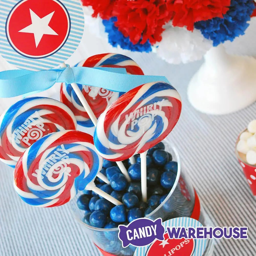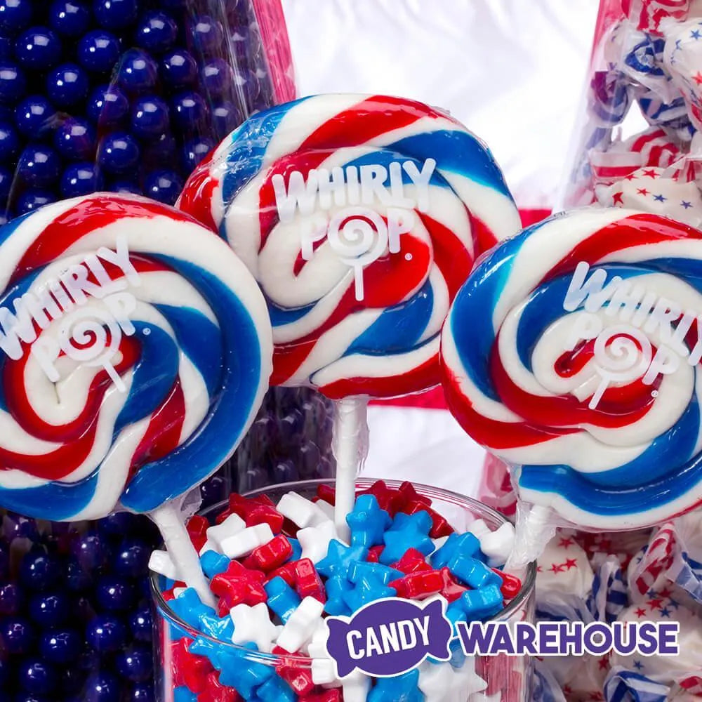 Display box contains 24 Patriotic USA Whirly Pops, each with a net weight of 1.5 ounces.