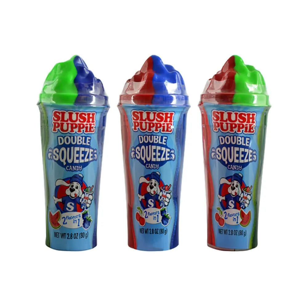 Double the squeeze, double the fun. The mixed SLUSH PUPPiE® Double Squeeze Candy contains two flavors, which are dispensed at the same time by squeezing the cup. Choose from Cherry/Blue Raspberry, Cherry/Watermelon & Blue Raspberry/Watermelon.