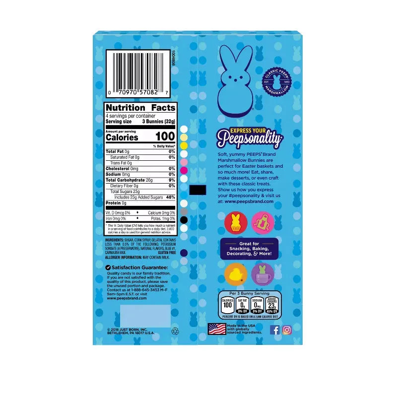 Pack contains 12 Blue Peeps Marshmallow Bunnies.