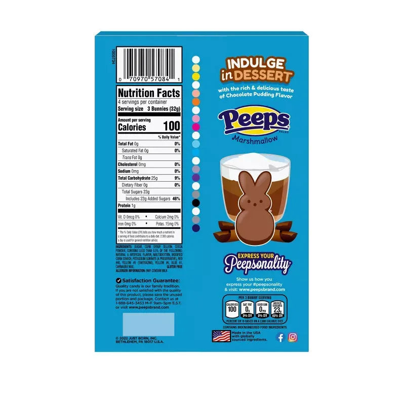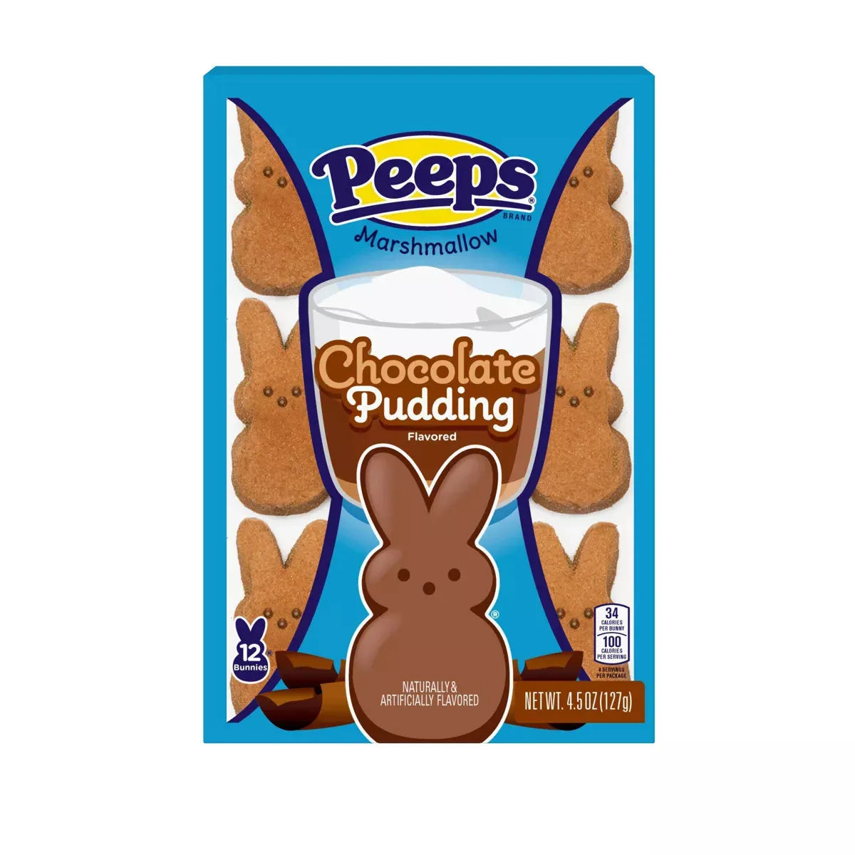 Pack contains 12 Chocolate Pudding Peeps Marshmallow Bunnies.