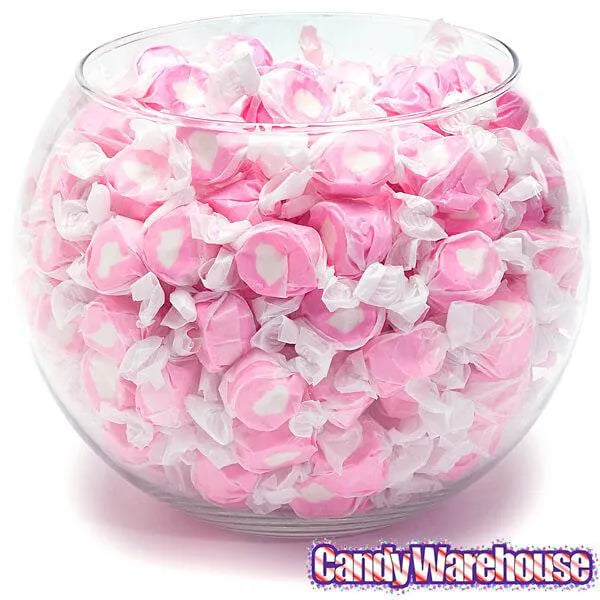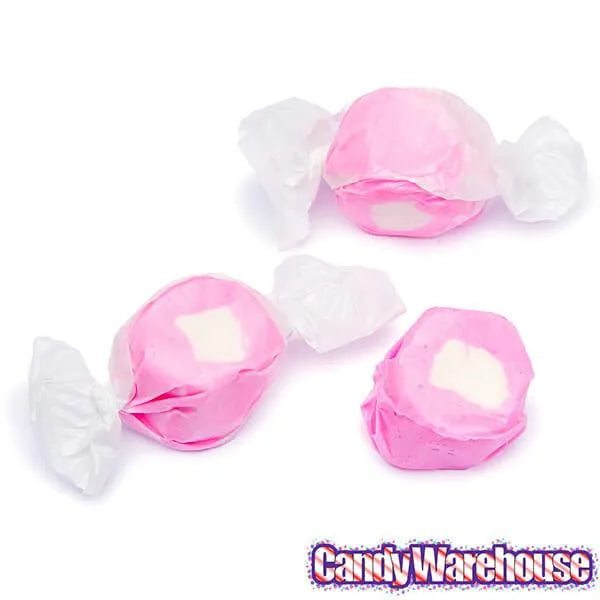 Bag contains 3 pounds of Pink with White Center Strawberry & Creme Salt Water Taffy Candy.