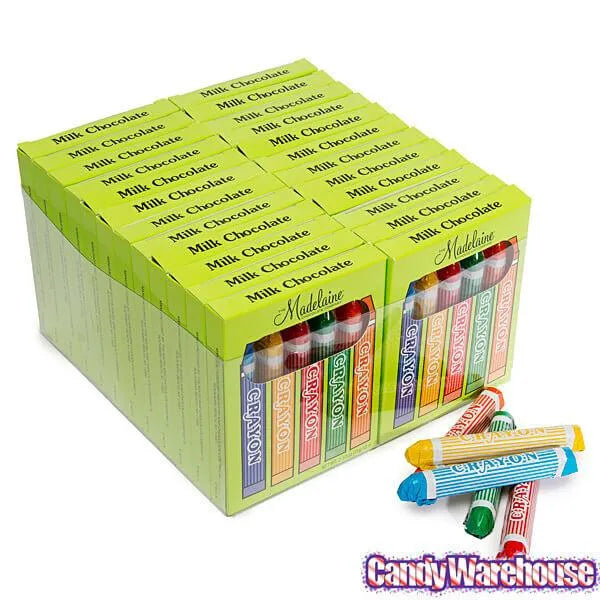 5 solid milk chocolate 1/2-ounce crayons wrapped in red, green, yellow, blue, and orange foils and packed in a great window box. Delivered in a counter top display with 24 boxes in each. Makes a great teacher thank you, back to school, birthday party favors, get well basket, Sweetest Day for the little ones. Perfect for boys or girls of all ages.