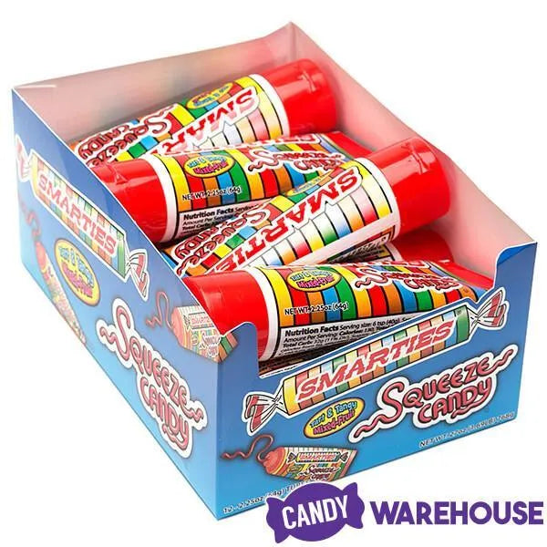 Display box contains 12 Smarties Squeeze Candy Tubes, each with a net weight of 2.26 ounces.