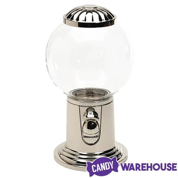 Dress up that party with this elegant gumball machine and candy dispenser! Measuring 9 inches tall, this unique gumball machine is perfect for mounds of candy or gum. Designed with a push button, this candy machine conveniently does not have a money slot, allowing for free dispensing at parties or events. Made of silver plated metal with a glass globe, it is the perfect addition to any affair!