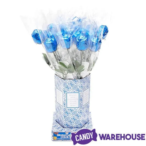 The best gift combination? Flowers and chocolate of course! Delicious Belgian milk chocolate is molded into the shape of a rose and then wrapped in distinctive metallic foil of a royal blue color. Whether you're designing a candy bar for a wedding or bat mitzvah, celebrating Mother's Day, or hosting a baby shower, these long stem blue chocolate roses offer a unique solution for candy in royal blue!