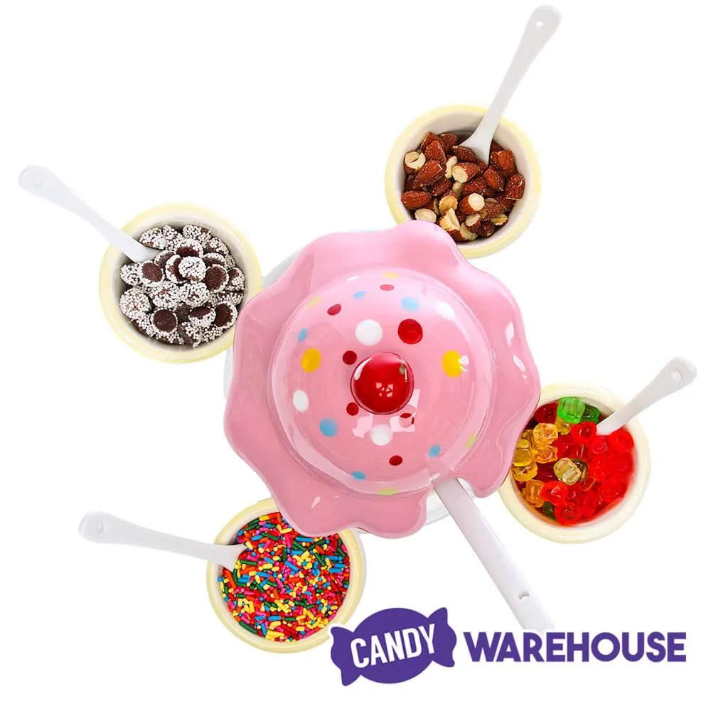 That’s why this hand painted, earthenware Ice Cream Social Topping Spinner is the perfect accessory to any dessert buffet. Four small cups and one larger bowl -- all sporting an ice cream cone design -- hold five different toppings, so you can be sure to please all your guests! The four cups rotate in a circle around the center bowl so it’s easy to select the specific topping you desire, whether it be M&M's Minis, nuts, sprinkles, strawberry sauce, or chocolate chips. The largest container features a cute lid resembling a scoop of ice cream, and it can be with warm caramel, fudge or whipped cream, or even a little extra of your favorite topping!