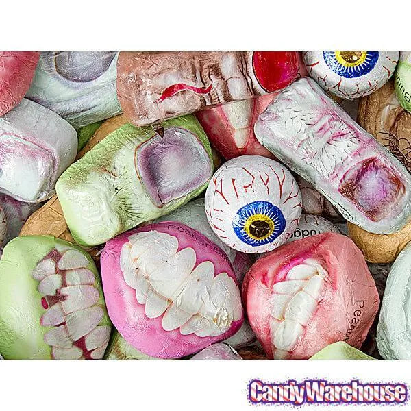 Grotesque chocolate treats from the mad scientist lab of Dr. Scab, M.D..... chocolate fingers and toes, ears, fangs, peanut butter filled lips, and fudge-filled eyeballs are sure to fright and delight!