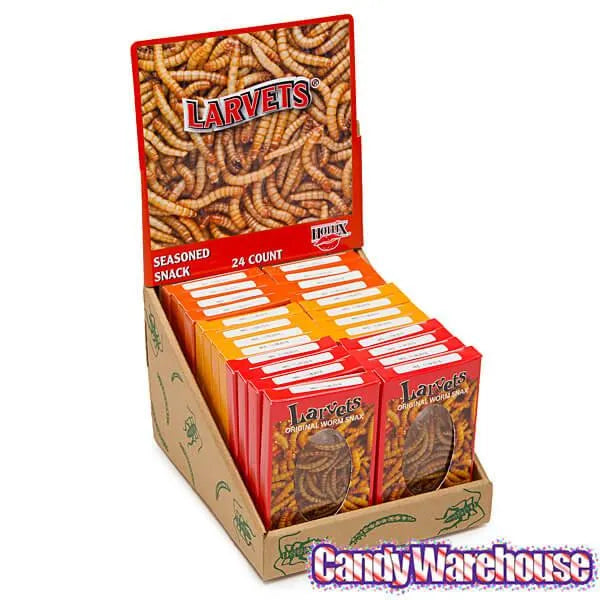 Display box contains 24 packs of Larvets Dried Larva Snacks.