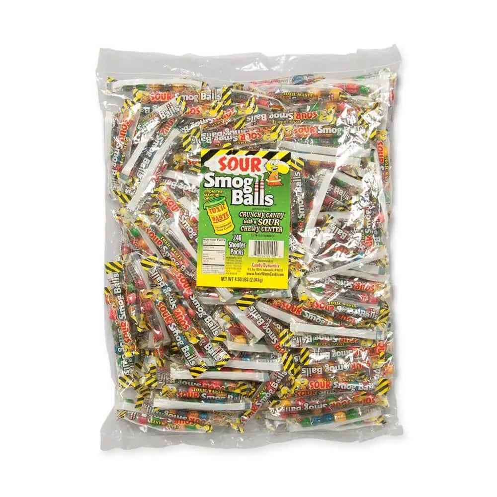 Tub contains 240 packs of Toxic Waste Sour Smog Balls Candy.