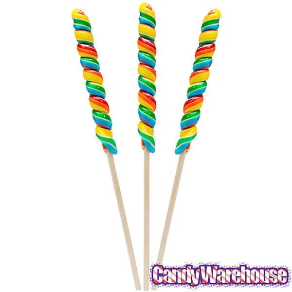 Long ago, unicorns roamed the plains in numbers that rivaled the mighty buffalo. Then humans came, and the unicorns were sought after in great numbers for their sugary and delicious rainbow horns. Their numbers declined and there was concern that they would go the way of the passenger pigeon, dodo or quagga. Luckily, thanks to responsible management programs and concerned citizen-stewardship from folks like the CandyWarehouse Elves, today there is a thriving, sustainable population of the majestic, delectably horned animals. Responsibly enjoy these sweet Rainbow Unicorn lollipop antlers.... a tornado of sweet, colorful candy twirled around a 12-inch wooden stick!