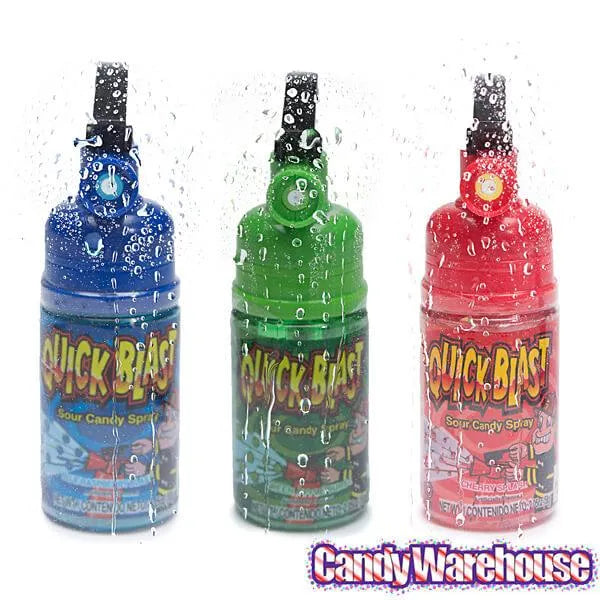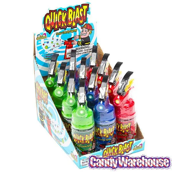Display box contains 12 Quick Blast Fire Extinguisher Sour Candy Spray Dispensers, each with a net weight of 2 ounces.