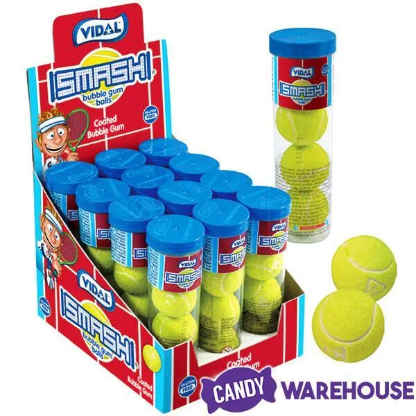 Display box contains 12 Smash Tennis Ball Sour Bubblegum Tubes, each with 4 gumballs.