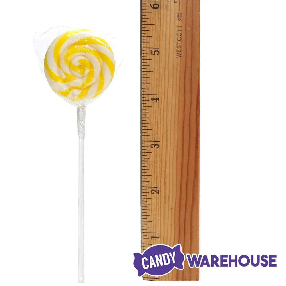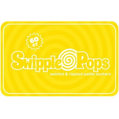 Resealable tub contains 60 individually wrapped Yellow Swipple Pops Petite Swirly Ripple Lollipops.