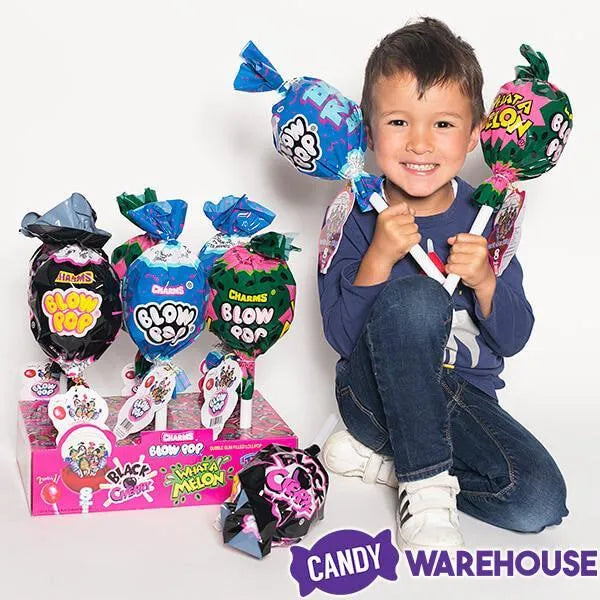 Maintain your reputation for being the hippest parent in the ‘hood by procuring this epic 6-piece display of Charms Giant Blow Pops - Fun Flavors for your kid’s party. Little people go nuts for these gargantuan Giant Blow Pops containers that lead to enormous laughs and massive amounts of fun. Each of the six prodigious plastic pops contains eight bubble gum filled lollipops — enough to make 48 excited kids hugely happy. Luscious fruit flavors lurking inside the regular-size Blow Pops lollipops include Blue Razz Berry, Black Cherry, and What a Melon. Each sucker delivers a mighty sweet hard candy shell encasing a Charms gum center for hours of bubblicious fun. Count on Candy Warehouse to carry all the classic Charms Blow Pops you love most in single-flavor and taste-bud-tantalizing assortment boxes.