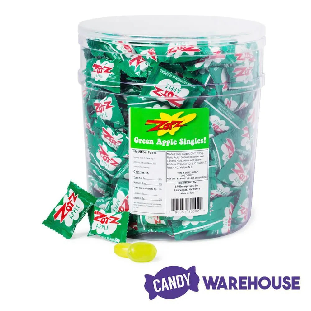Tub contains 300 pieces of Green Apple Zotz Sour Fizz Candy.