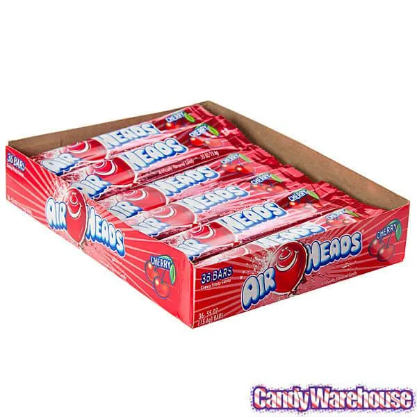 Display box contains 36 Cherry AirHeads Taffy Candy Bars, each with a net weight of 0.55 ounce.