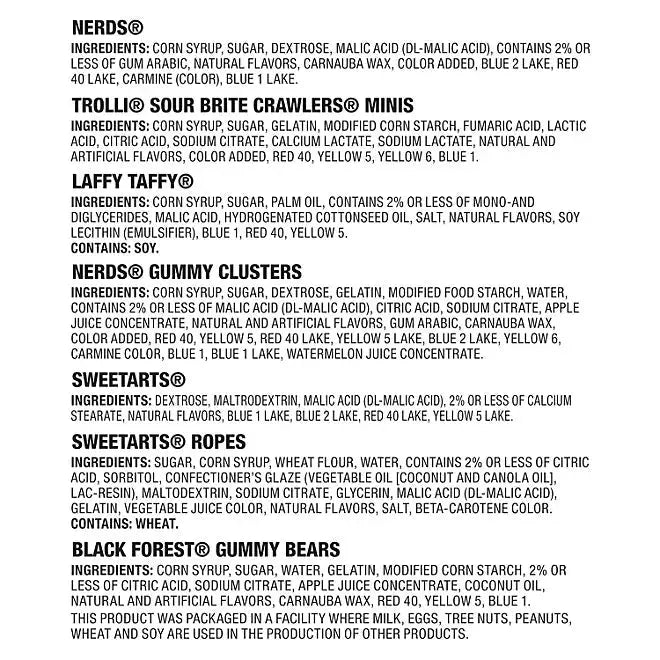 Satisfy your sweet cravings with the Party Mix Bag of Candy! This jumbo-sized bag is perfect for sharing—or keeping all to yourself! Packed with 120 pieces of everyone's favorite treats, it’s a guaranteed sugar rush for candy lovers. Inside, you'll find a little something for every taste bud, from Sweetarts Original and Sweetarts Ropes to Trolli Sour Crawler Minis, Laffy Taffy, Nerds, Nerds Gummy Clusters, and Black Forest Gummy Bears. Dive in and treat yourself to a candy paradise!