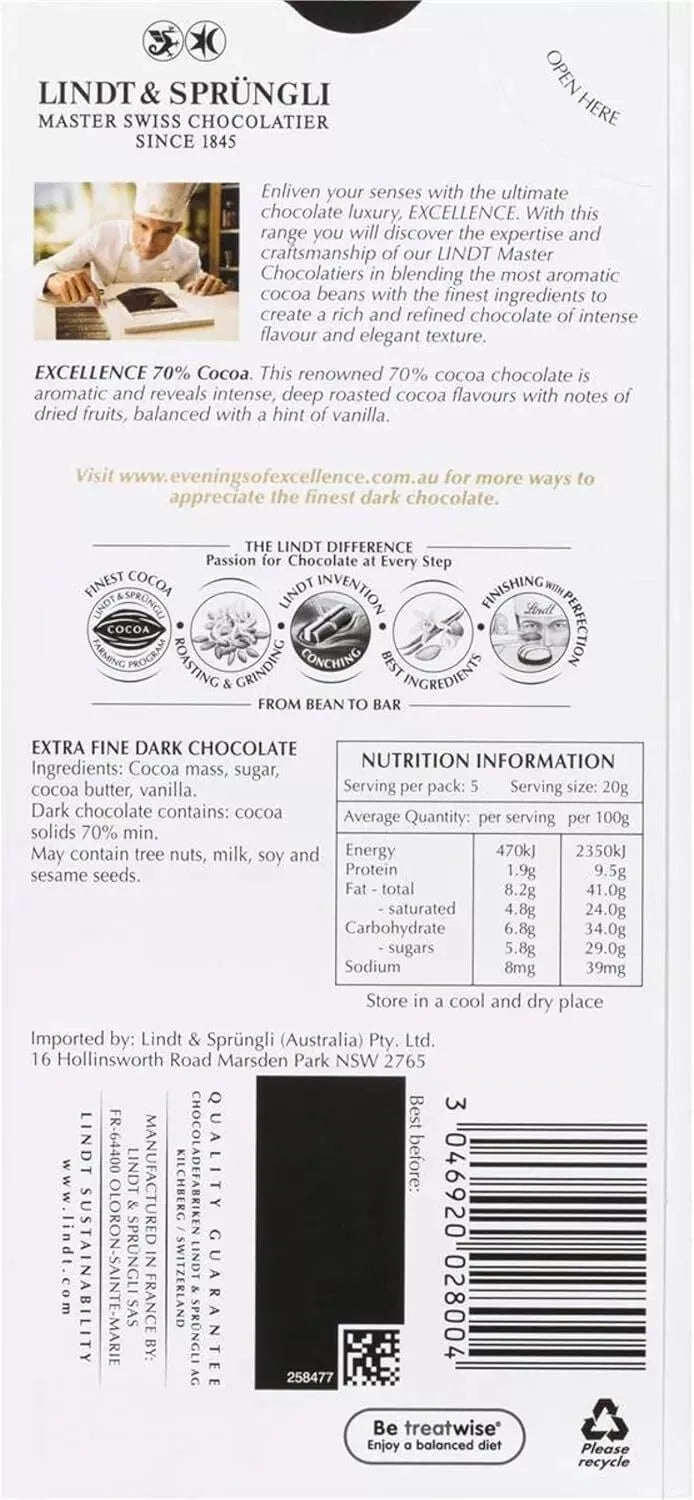 Lindt Excellence 70% Cocoa Dark Chocolate Bar: 12-Piece Box