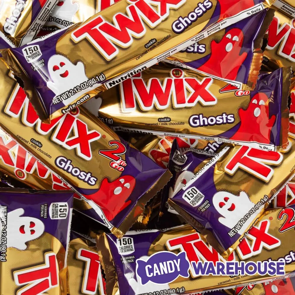 Display box contains 24 Twix Ghosts Halloween Candy Bars, each with a net weight of 2.12 ounces.