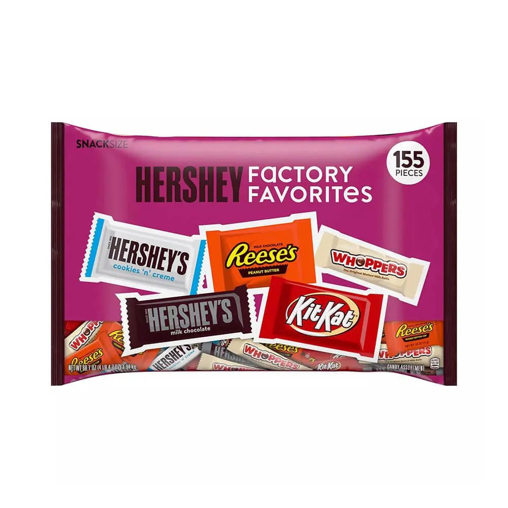 Bag contains 155 Hershey's Factory Favorites Snack Size Candy Bars.