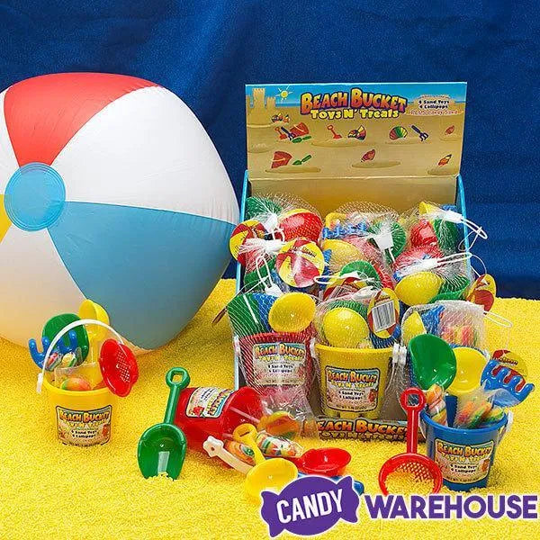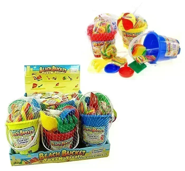 Display box contains 12 Mini Beach Buckets Toys-n-Treats Packs. Each with a net weight of 1.48 ounces