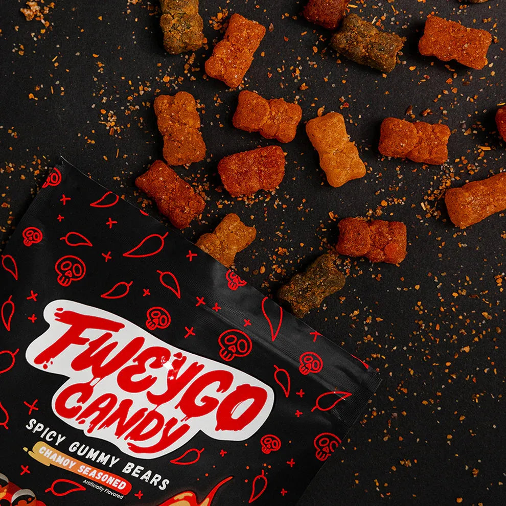 Experience the bold fusion of sweet and spicy with Fweygo Spicy Gummy Bears! These soft, chewy gummies are crafted to deliver the perfect balance of fruity sweetness and fiery chamoy, creating a mouthwatering blend of heat and tangy goodness. With their classic gummy bear texture and an extra kick, they’re an exciting twist on a beloved treat. Packaged in a convenient peg bag, they’re perfect for snacking on the go. Whether you're a fan of chamoy, love a little spice, or just want to try something unique, Fweygo Spicy Gummy Bears will keep your taste buds craving more!
