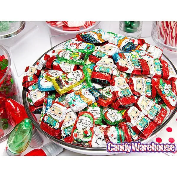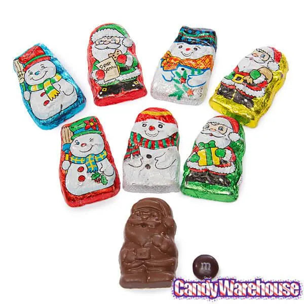 Bag contains 12 pounds of Foiled Mini Chocolate Snowmen and Santas Candy.