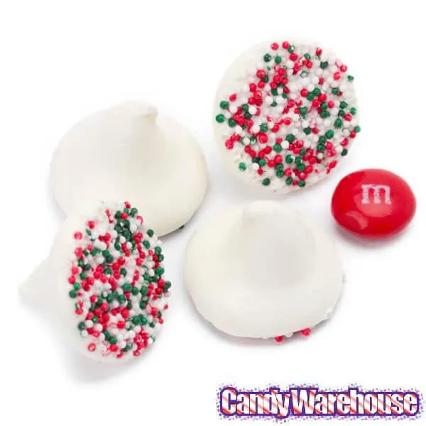 Large white mint chocolate chips bottom dipped in tiny nonpareil candy balls of green and red. Perfect for Christmas candy dishes!