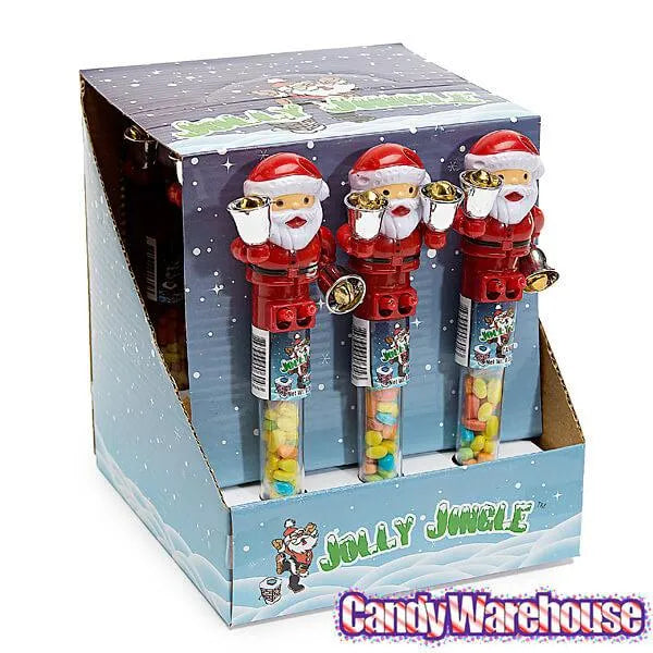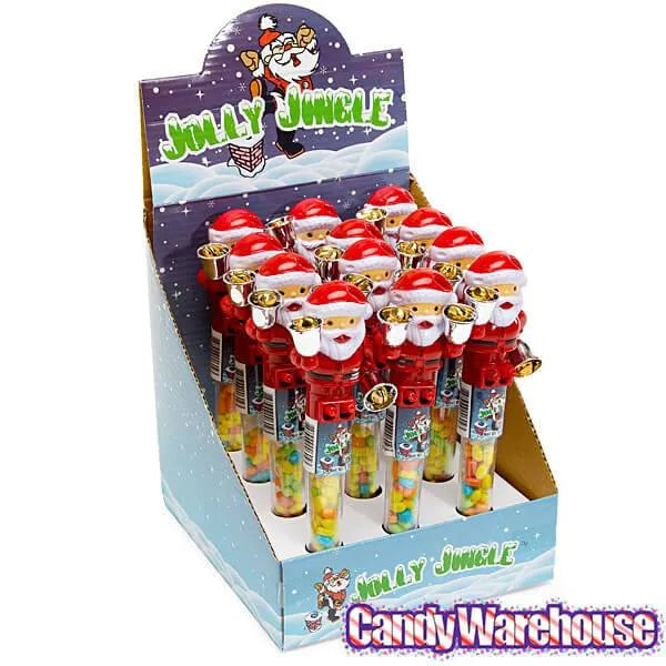 Display box contains 12 Jolly Jingle Candy Filled Santa Claus Toy Candy Dispensers, each with a net weight of 0.35 ounces.