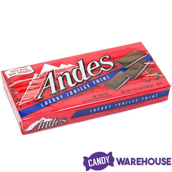 If George Washington had an Andes Cherry Jubilee Thins 28-piece box of candy in his pocket, would his father’s cherry tree have remained standing? While this enduring presidential tale is mythical, there’s no doubting cherry Andes mints are an iconic American favorite. Made with real cherries for orchard-fresh ripe and juicy flavor, Andes Cherry Jubilee chocolates satisfy a sweet tooth in seconds. As delectable as a chocolate-covered cherry only creamier and rectangular, these bite-size morsels are individually foil wrapped for grab-and-go indulging. Candy Warehouse cannot tell a lie: Rich cherry crème layered with dark chocolate makes Andes cherry candies a legendary flavor combination.