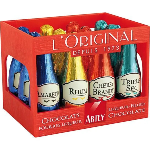 Plastic crate contains 12 Abtey Liquor Filled Dark Chocolate Bottles.
