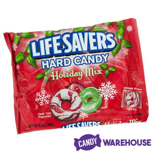 Classic LifeSavers hard candy circles featuring an assortment of holiday colors and flavors:Red - CherryGreen - AppleWhite & Red - Candy Cane Peppermint