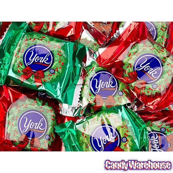 Miniature sized York Peppermint Patties, a classic since 1940, all dressed up in red, green and silver Christmas wreath wrappers. Share the love of cool peppermint covered in rich, dark chocolate with YORK Holiday Peppermint Patties! Just the right size for snacking, candy dishes, and stocking stuffers, these delicious treats are also perfect for adding to desserts and even melting and drizzling over popcorn.