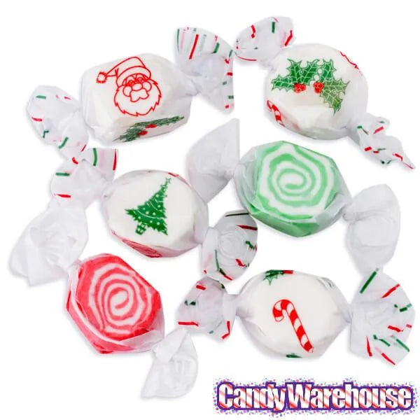 A festive assortment of Christmas taffy candy in yummy flavors of fruit and peppermint. And because this holiday salt water taffy is whipped, it won't stick to your teeth or dental work...no trips to the dentist to replace fillings or crowns!