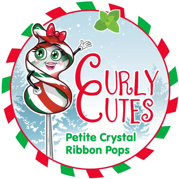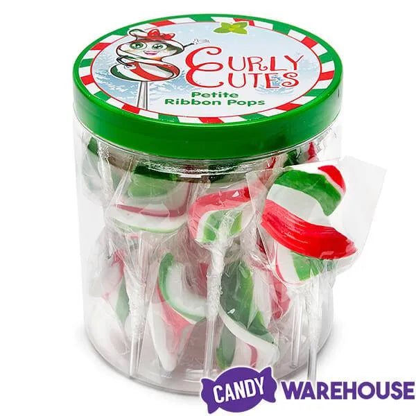 Jar contains 20 individually wrapped Christmas Peppermint CurlyCutes Pops Petite Ribbon Lollipops.