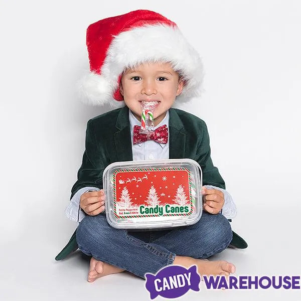 Resealable plastic tub contains 100 Red, Green, and White Mini Candy Canes.