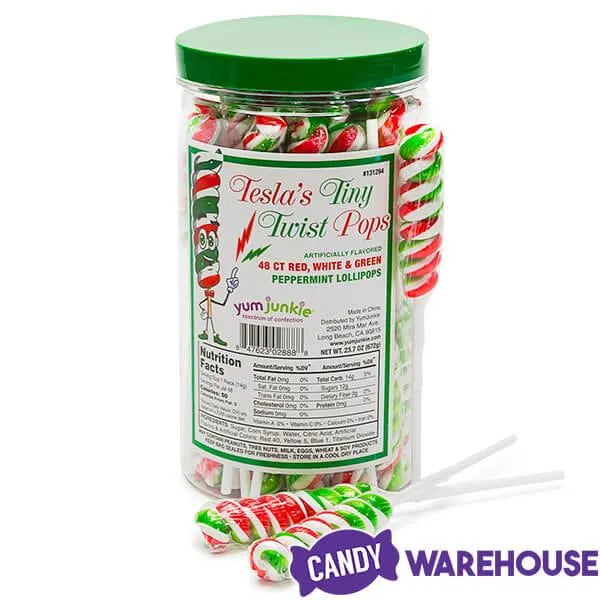 Jar contains 48 individually wrapped Christmas Tesla's Tiny Twist Pops.