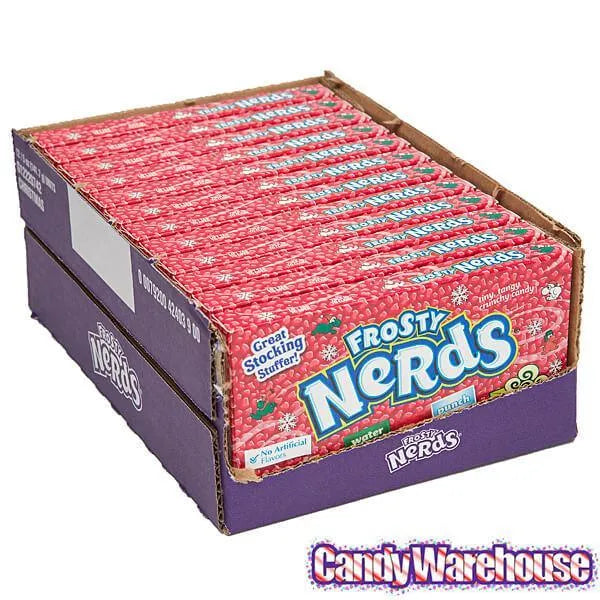Tangy candy nuggets featuring festive Christmas colors of red, white, and green! Flavors include watermelon, wild cherry, and punch.Box contains 12 Frosty Nerds Candy Packs, each with a net weight of 5 ounces.