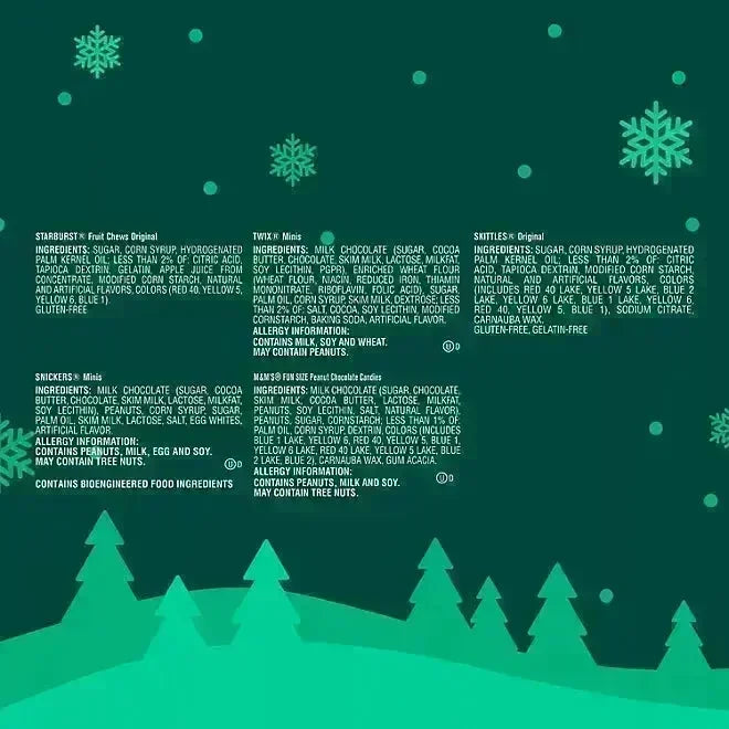 Make the holidays even sweeter with this 4.75 pound, 185-piece Christmas Candy Variety Pack, featuring a festive mix of M&M'S, SNICKERS, TWIX, SKITTLES, and STARBURST! Each piece is individually wrapped in fun-size and mini packs, ready to bring cheer with every bite. With milk chocolate favorites like SNICKERS and TWIX, plus fruity gummy treats like SKITTLES and STARBURST, there’s something for everyone. Perfect for stuffing stockings, sharing during Christmas movie nights, or filling candy dishes at home or the office, this holiday assortment adds a deliciously decorative touch to the season!