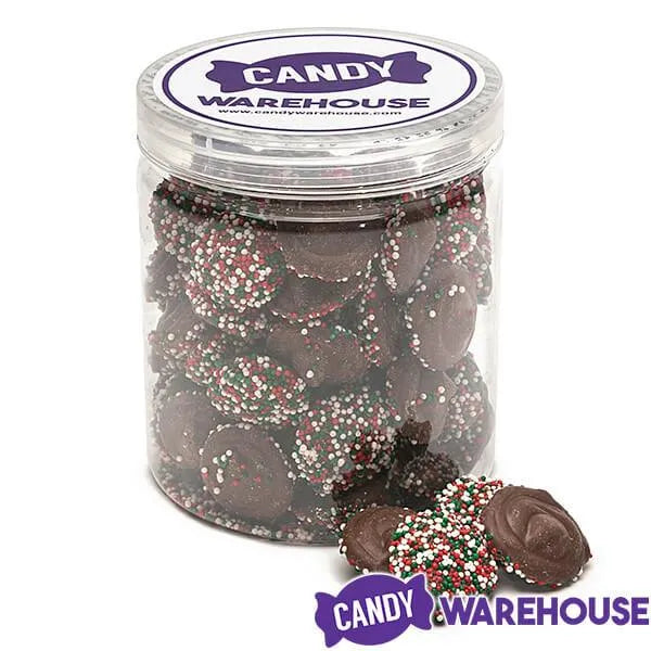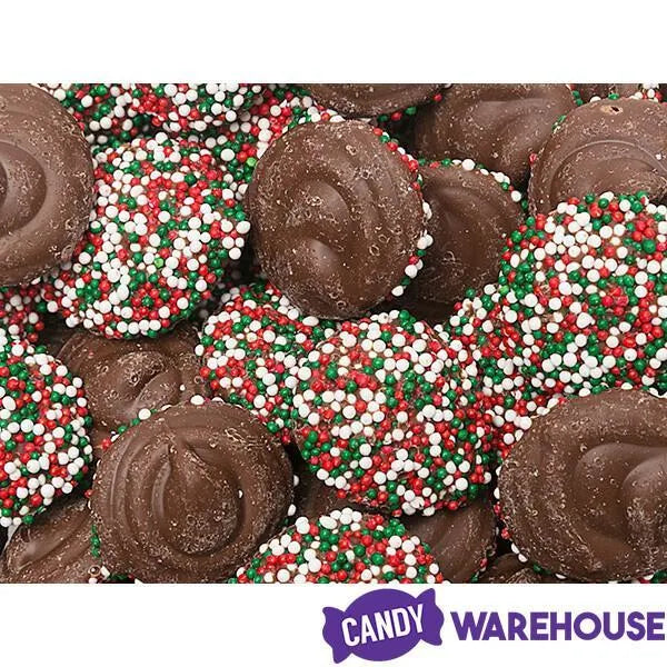 Jar contains 1 pound of Christmas Milk Chocolate Nonpareils Discs.
