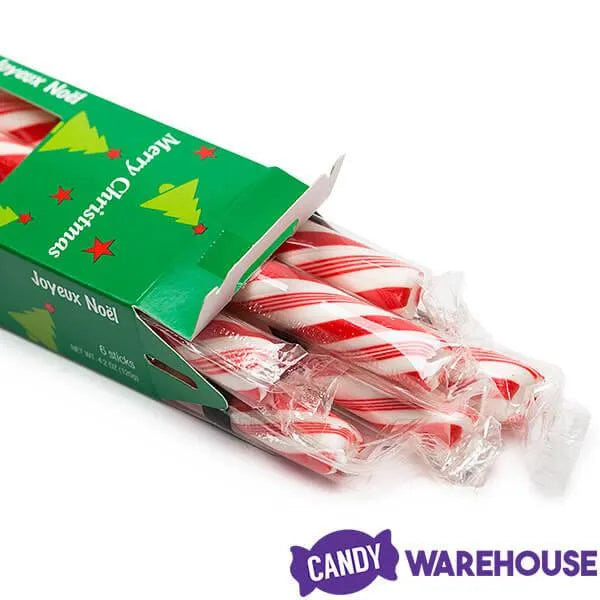 Reward good boys and girls of all ages with Atkinson Christmas stocking stuffer mint sticks candy packs. This brightly colored, festive 12-piece display is a thoughtful way to thank customers or coworkers when the holidays roll around. It’s also great for safe sharing at schools since the candy cane sticks are gluten-free, vegan-friendly, and kosher certified. Atkinson’s handmade mint sticks are all natural and flavored with the highest-quality peppermint oil for stocking stuffers they’re not likely to forget. Each beautifully decorated box in this 12-piece display from Candy Warehouse contains six seasonally delicious, cool and refreshing, red and white peppermint sticks.