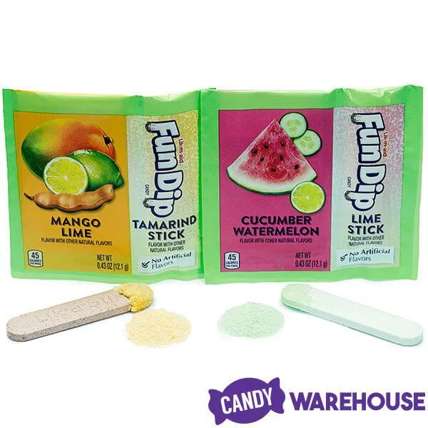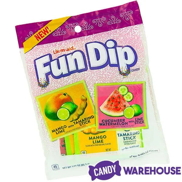 Inspired by the traditional corner fruit stands found in Latin America, Fun Dip tropical mix brings an authentic twist in every dip. The lime and tamarind flavored sticks create just the right combination of sweet and tangy when dipped in Mango Lime or Cucumber Watermelon. Featuring unique flavors preferred in Hispanic cultures, these new Fun Dips with a Mexican flair are sure to surprise and delight your taste buds. Simply lick and dip the included candy stick into the candy powder for sweet and tangy flavor combinations reminiscent of the tropics of Mexico and Central America.