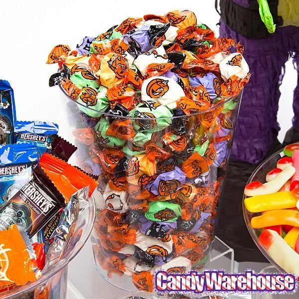 Yummy, chewy taffy featuring spooky wrappers with black cats, ghosts, and pumpkins. Perfect for Halloween parties and events!
