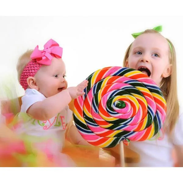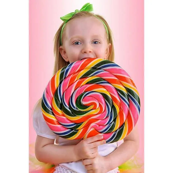 This giant 3-pound Swirl Pop will wear out any tongue! An amazing rainbow of candy colors are swirled into a huge lollipop with a diameter of approximately 9 inches. Each pop has a fabulous fruity flavor. Wrapped in cellophane and packed in a sturdy gift box.