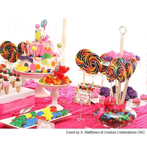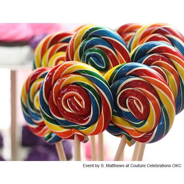 Yummy hard candy swirls in a rainbow of bright colors that twist into a giant candy circle of sweet decadence! Because they are hand pulled, these pops feature a glassy sheen making them confectionery masterpieces. An exquisite gift.
