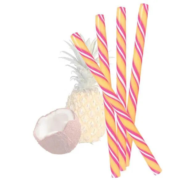 The island colors of yellow, white, and pink adorn these gourmet hard candy sticks featuring a refreshing pina colada flavor!