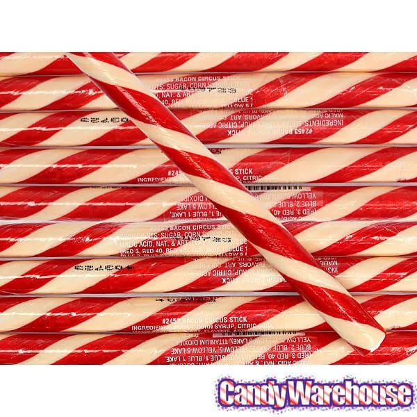 Box contains 100 individually wrapped Bacon Circus Sticks Hard Candy Sticks.