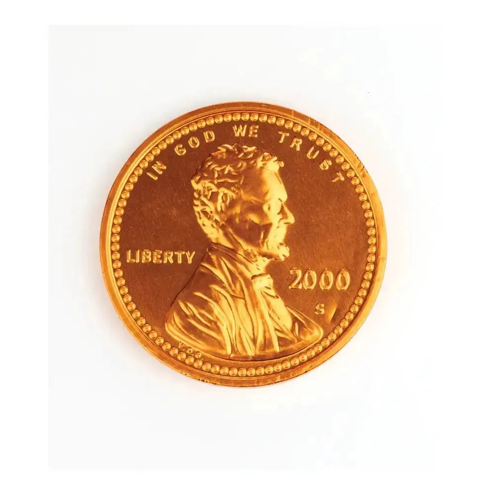 That’s right -- these pennies, quarters, dollars might look like super-sized coins, but under the layer of intricately embossed foil lies a delicious piece of solid milk chocolate! Each scrumptious candy measures just about 4 inches in diameter -- that’s two entire ounces of chocolate deliciousness per over-sized coin!