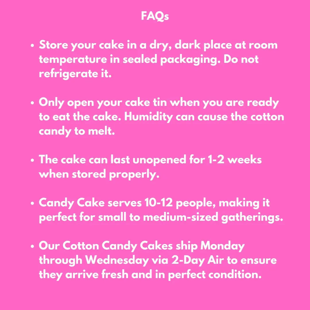 Upon arrival, your Cotton Candy Cake is ready to enjoy! Each cake comes with an instruction card detailing how to care for your cake, ensuring it remains fresh and delicious. Here are some important tips for storing your cake: